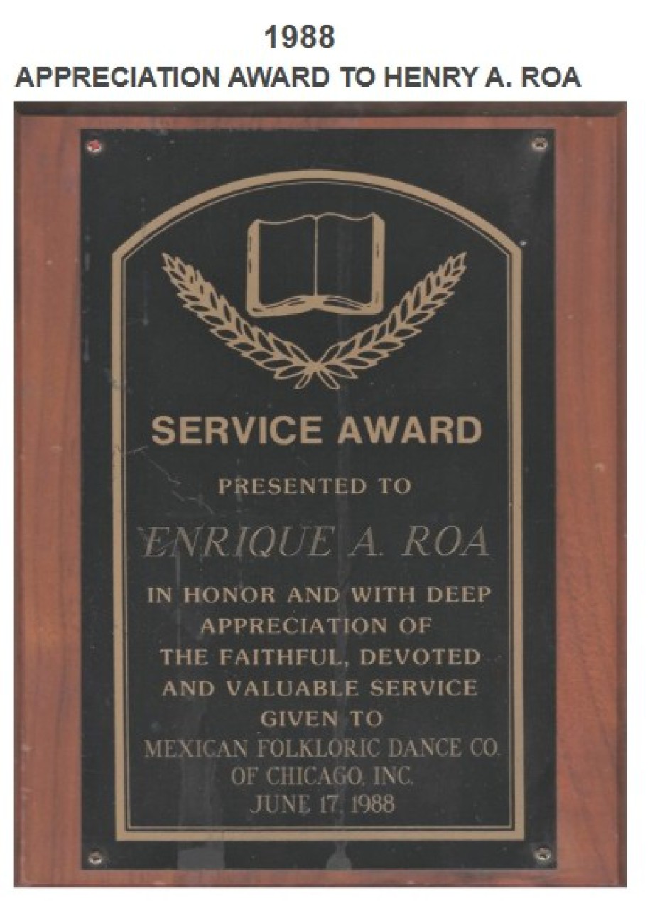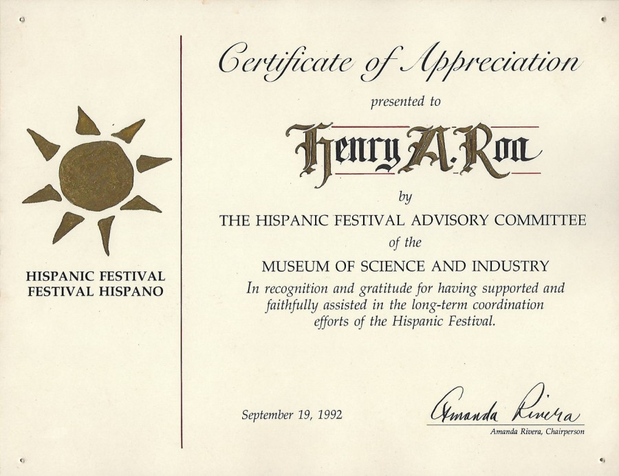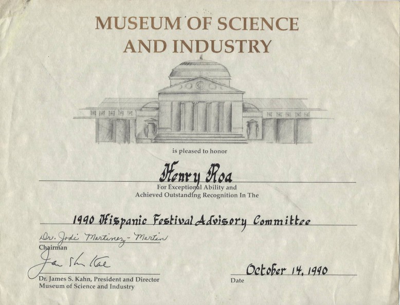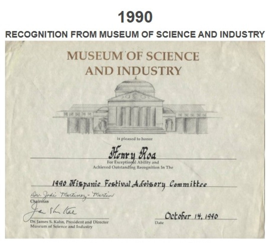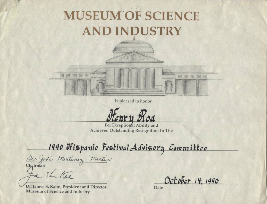 APPRECIATION TO HENRY A. ROA FROM MUSEUM OF SCIENCE AND INDUSTRY