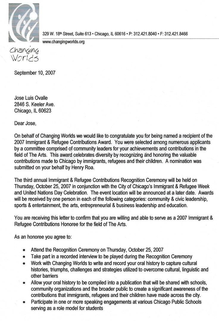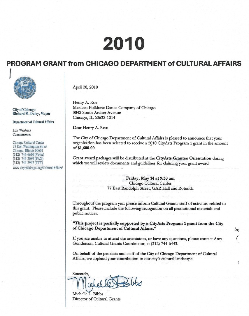 PROGRAM GRANT FROM CHICAGO DEPT. OF CULTURAL AFFAIRS