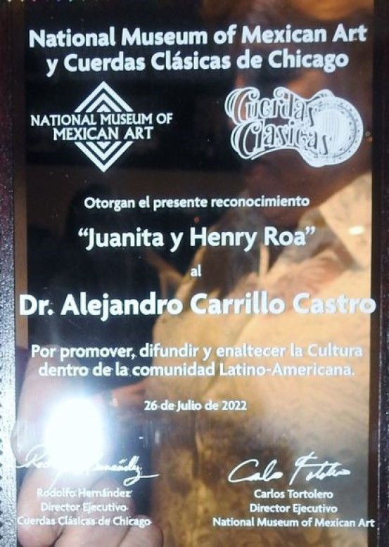 Cuerdas Clasicas & National Museum of Mexican Art initiate the Juanita & Henry Roa award; to Dr. Alejandro Carillo Castro