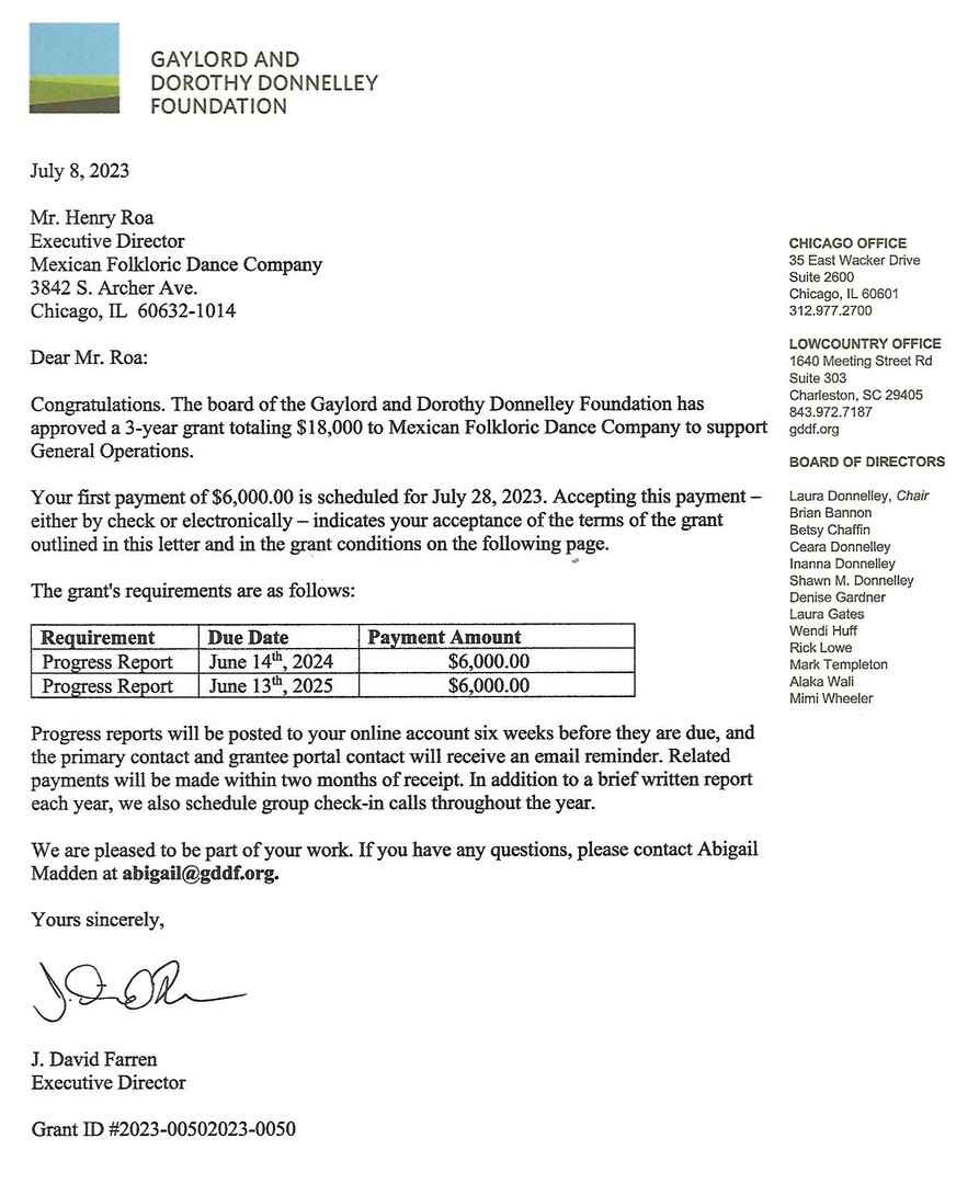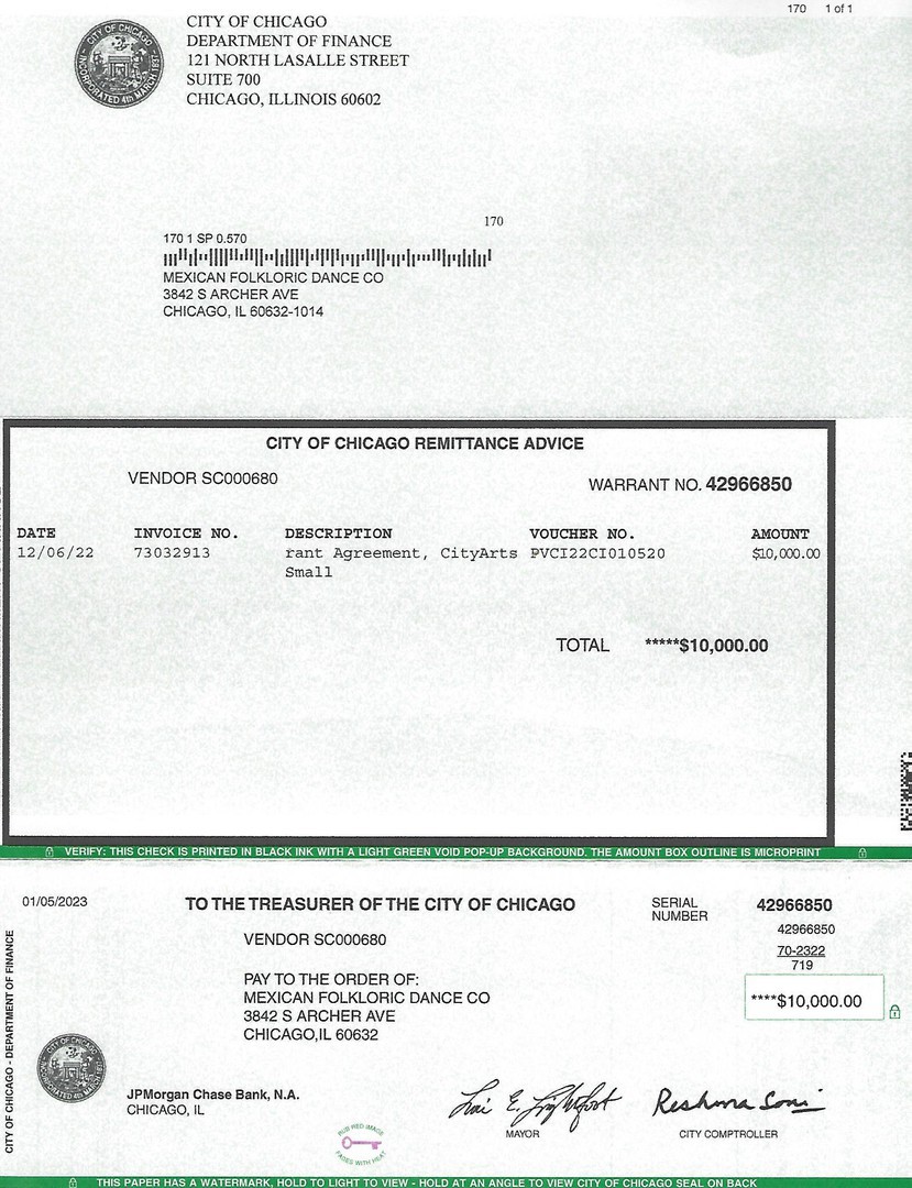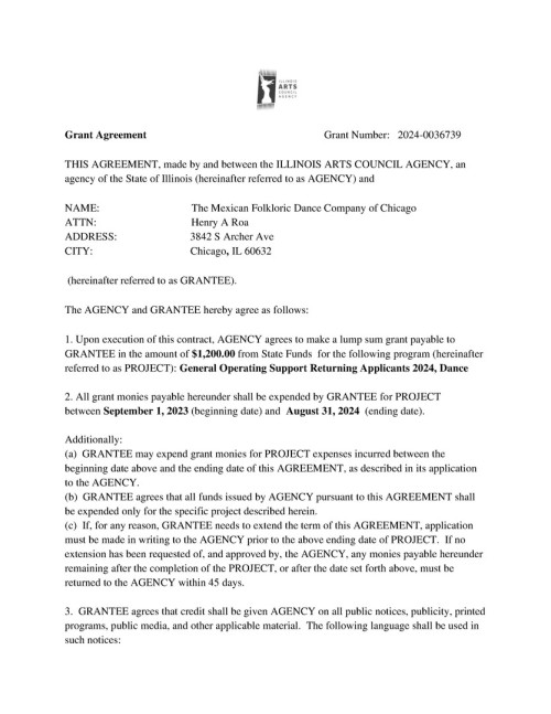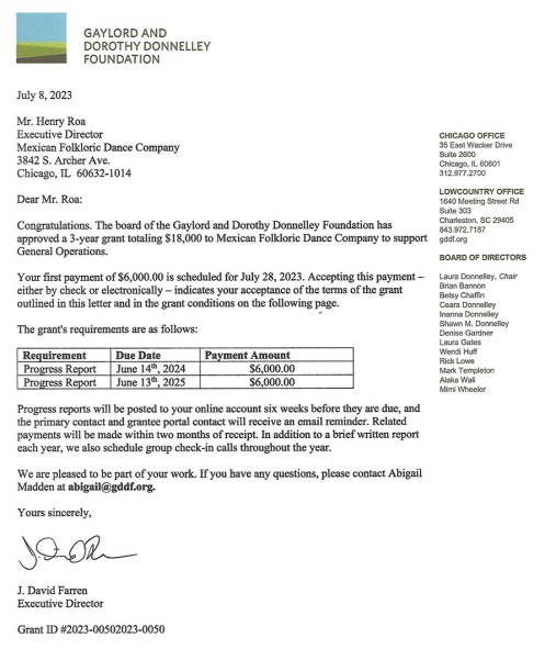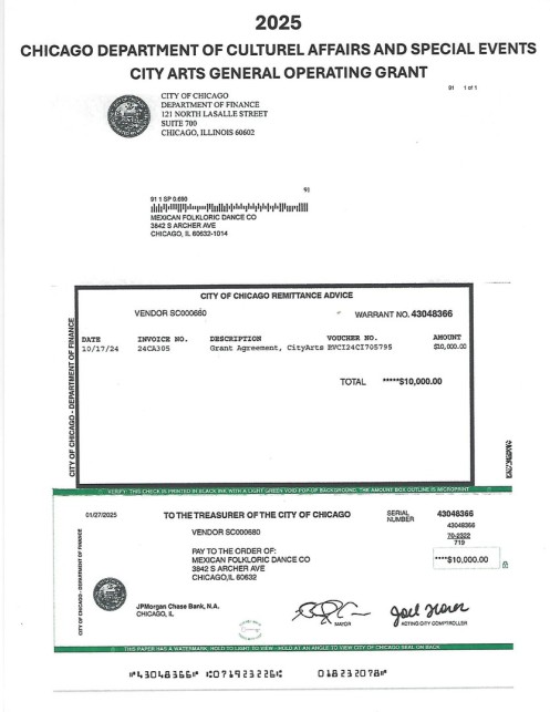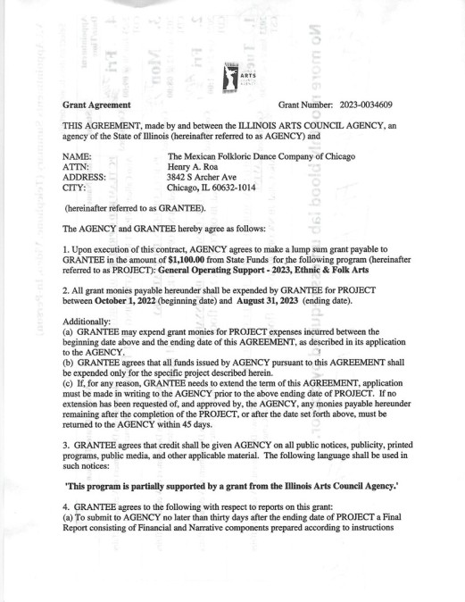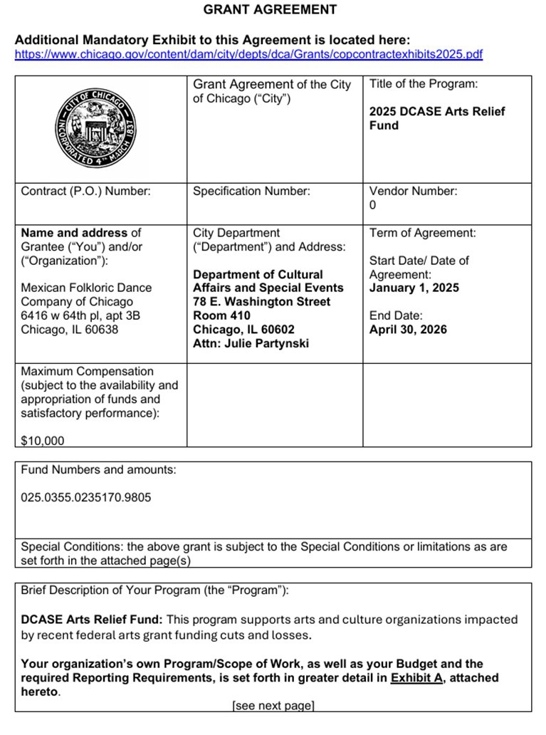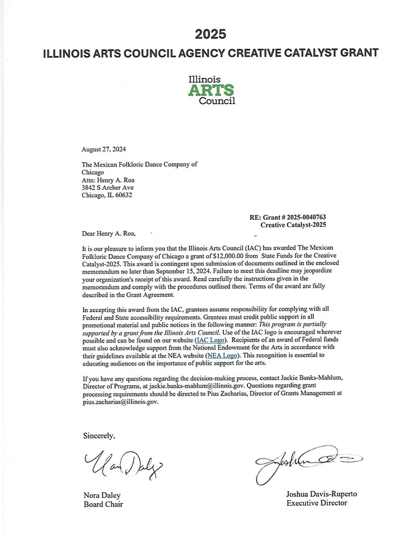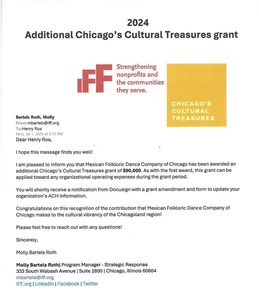 Congratulations! I am pleased to inform you that Mexican Folkloric Dance Company of Chicago has been awarded a Chicago’s Cultural Treasures grant of $140,000.00. The grant period is August 1, 2021 to July 30, 2024.